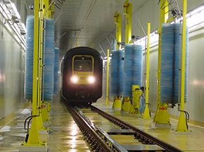鐵路列車自動清洗機可實現(xiàn)對列車車廂、火車頭等外面進行全面、徹底的自動清洗,設(shè)備主要由噴淋系統(tǒng)、洗刷系統(tǒng)、干燥系統(tǒng)、水處理系統(tǒng)(選配)、預(yù)警系統(tǒng)及控制系統(tǒng)等組成,可通過噴淋濕潤、預(yù)備洗刷、洗滌洗刷、漂洗洗刷和吹掃干燥等不同的清潔方式,配合列車勻速通過清洗工作場地除去列車表面的塵埃和污垢,達到運營列車潔凈要求。[查看詳情]